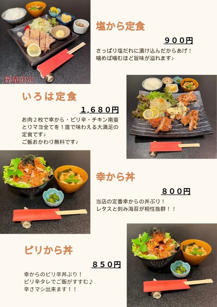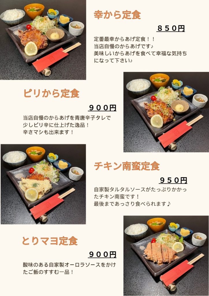 お食事は、からあげ、鶏ちゃんから一品料理まで豊富に取り揃えております。